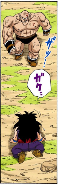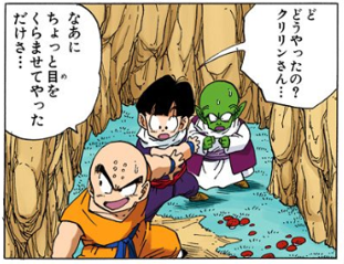 프리저의 뿔에 찔려 빈사 상태에 빠진 크리링을 보고